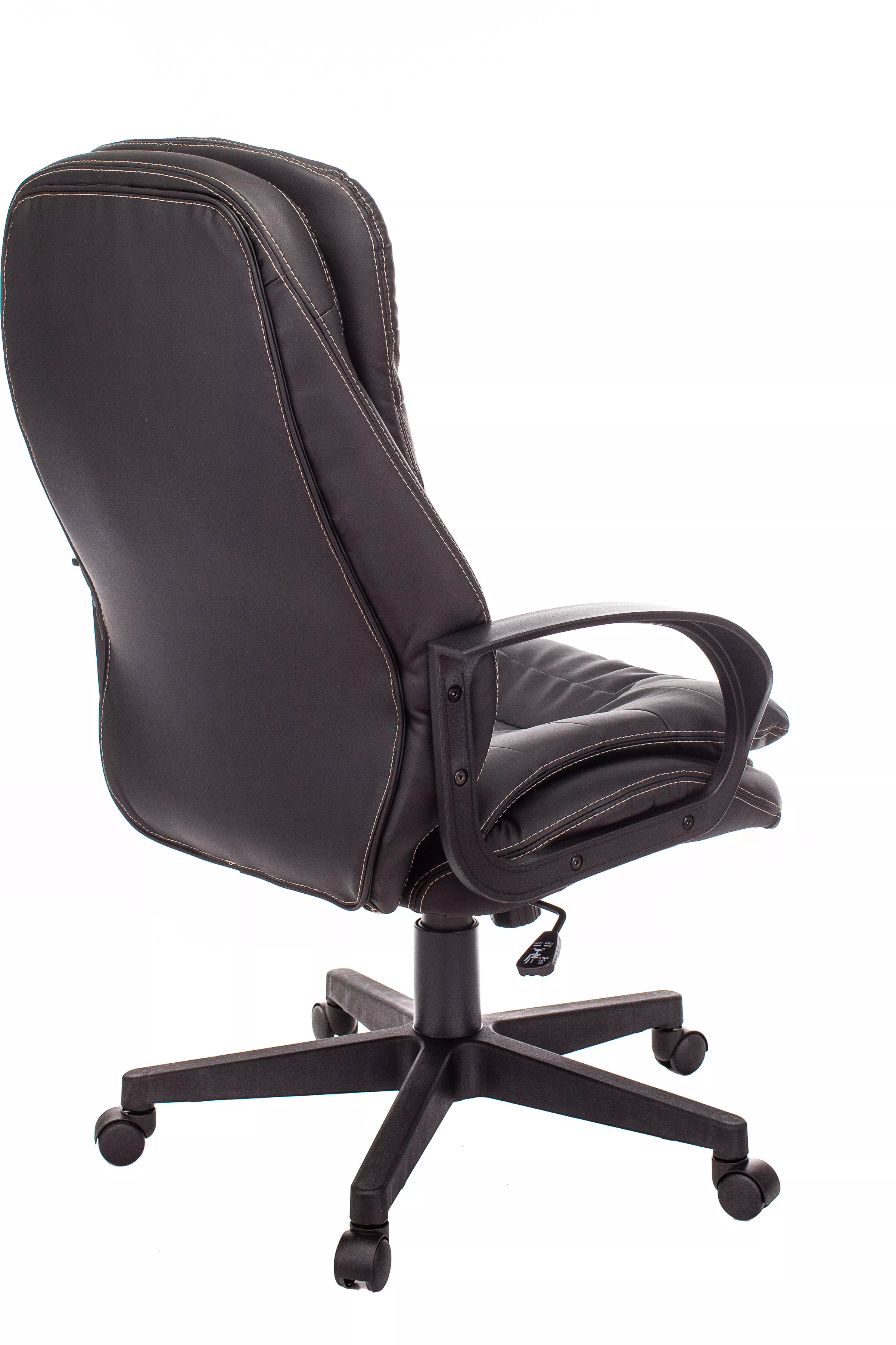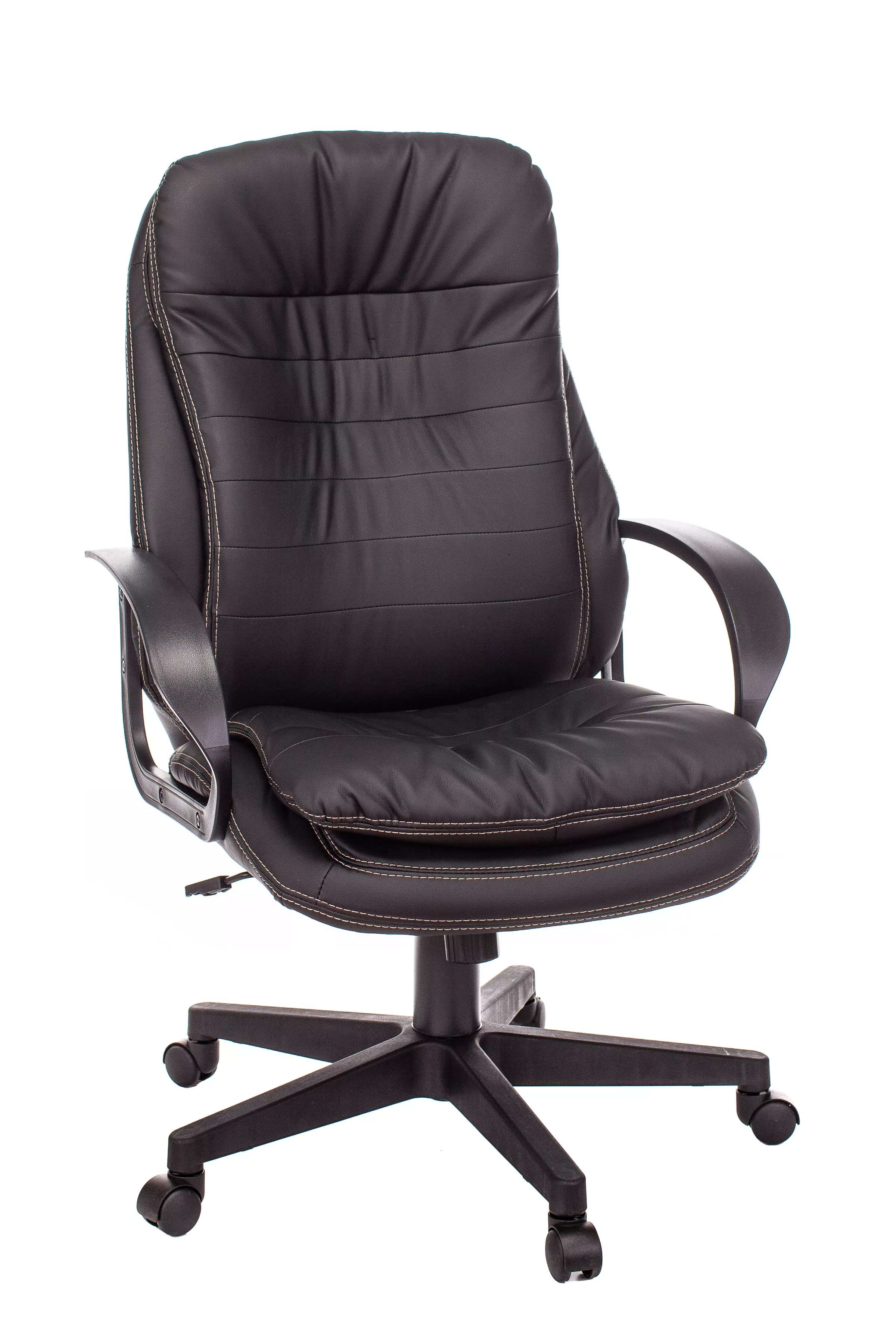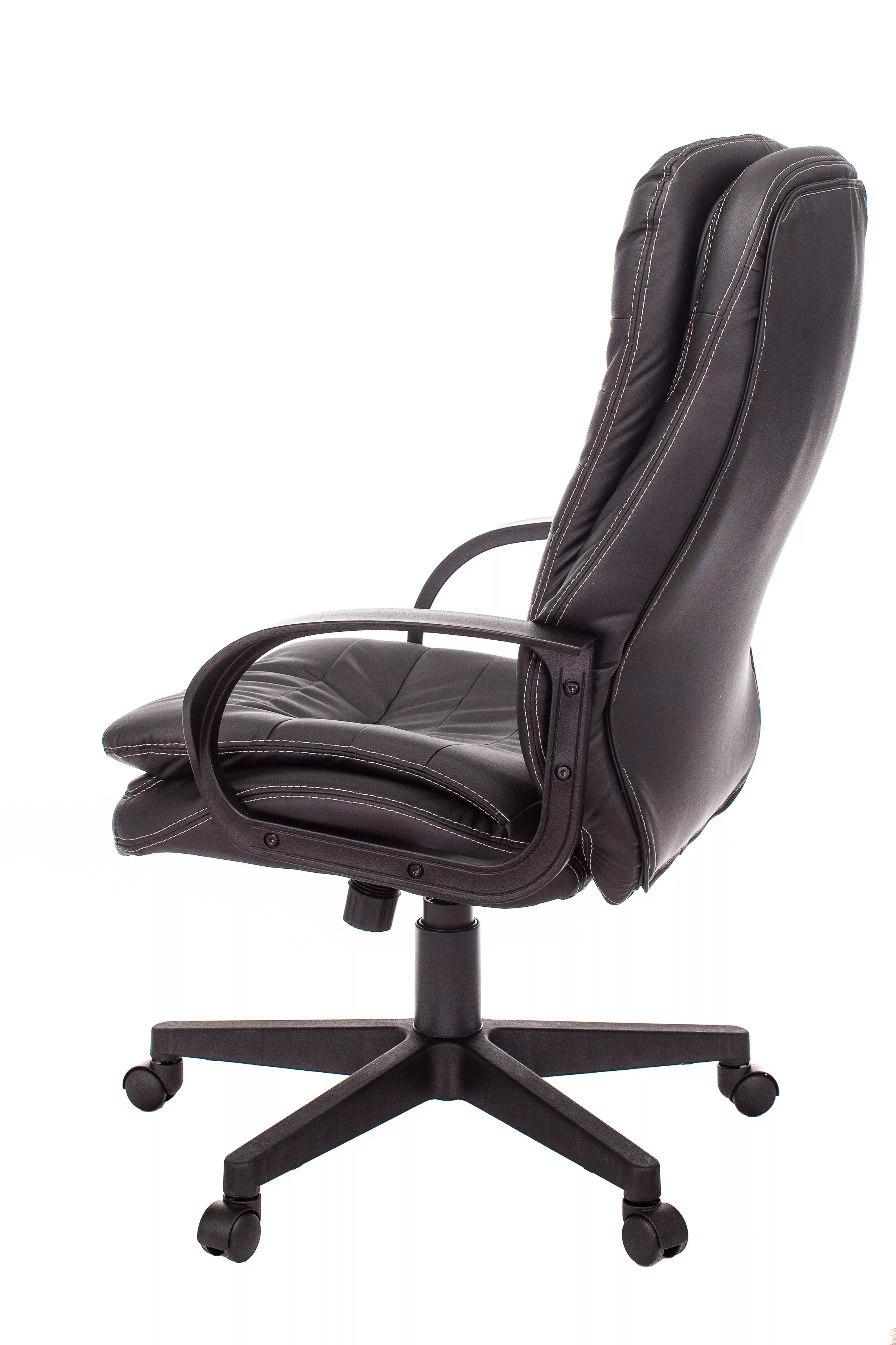 Обивка кресла выполнена из высококачественной экокожи черного цвета, которая не только стильно смотрится, но и легко чистится. Спинка кресла отделена от сиденья, что позволяет обеспечить лучшую вентиляцию и комфорт при длительном сидении. Высота кресла варьируется от 1065 мм до 765 мм с подлокотниками, а высота сиденья составляет 495 мм. Ширина сиденья — 565 мм, а глубина — 460 мм, что обеспечивает достаточное пространство для комфортного размещения.