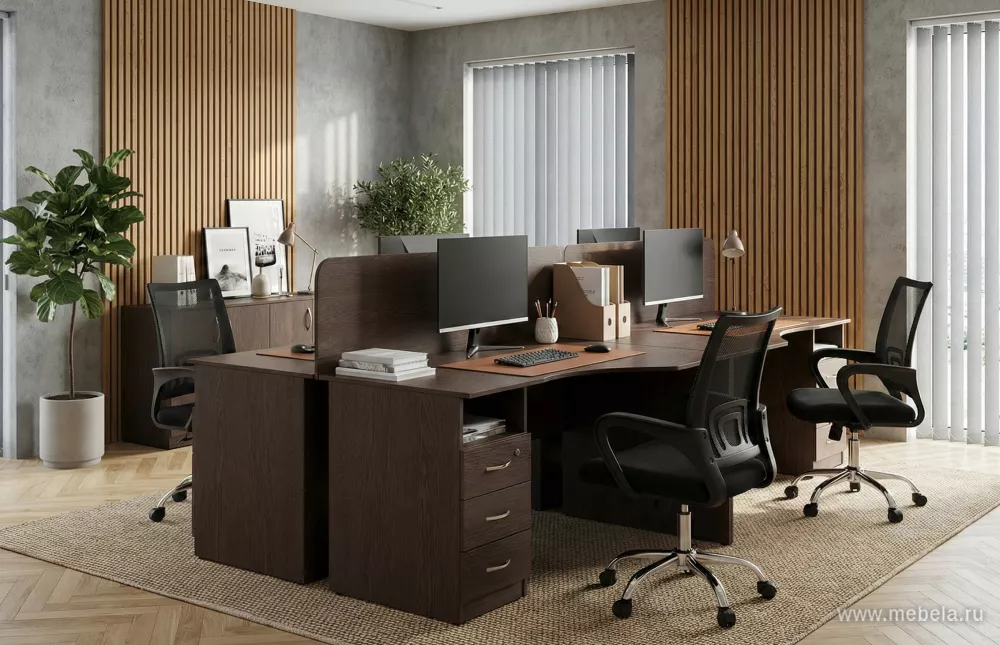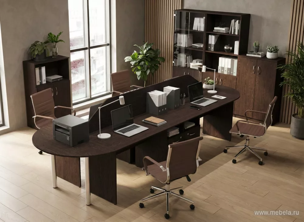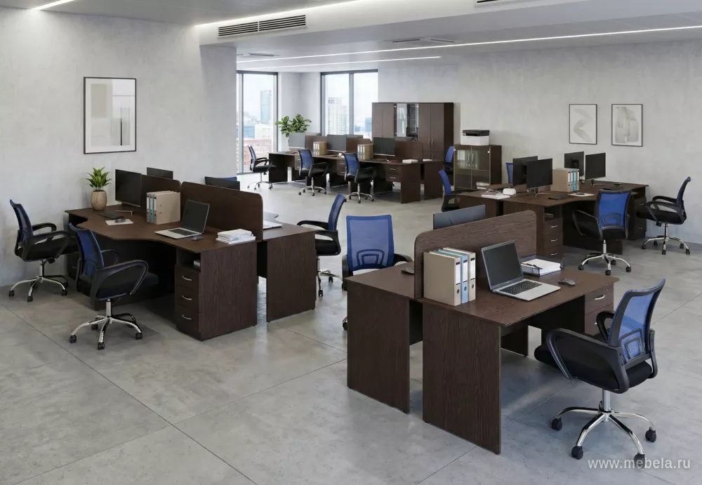 Офисная мебель для персонала Нова С (Nova S) - практичная мебель для рабочих мест сотрудников, выполненная из ламинированного ДСП 16 мм «Kronospan» с кромкой 2 и 0,4 мм. Надёжность конструкции обеспечивают регулируемые опоры М6, а металлические ручки добавляют удобство пользования. Цвет исполнения: Венге Цаво.